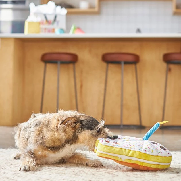 - Millennium Falcon cake plush toy squeaks and has crinkle paper for extra fun.