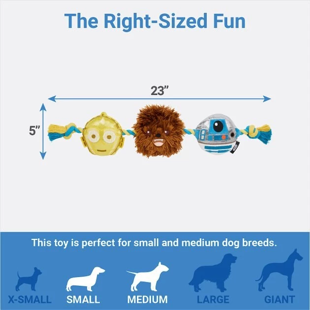 - Plush rope toy set features STAR WARS’ R2-D2, C-3PO and Chewbacca, each with a squeaker and connected by a rope.