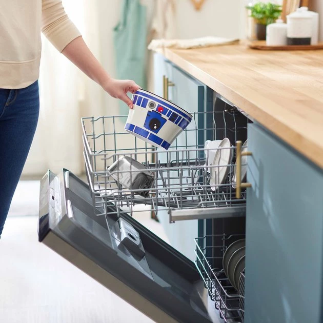 - Melamine bowl comes in white and features R2-D2’s face on the front.