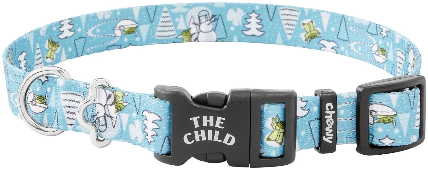 This holiday-themed Star Wars: The Mandalorian™ collar, featuring The Child building snowmen, will keep your canine companion feeling festive all through the holiday season. Made with durable, high-quality polyester that has an Ultra-Weld™ seal, it’s strength-tested to withstand up to seven times the maximum recommended weight for each size. Putting it on your dog is easy with the plastic rounded-edge buckle, plus the nickel-coated D-ring makes it simple to snap a leash on and get going. They come in different sizes you can adjust for a custom fit and with a separate ring to attach an ID tag. Grab the matching leash and harness to complete the whole walkwear set, only at Chewy.